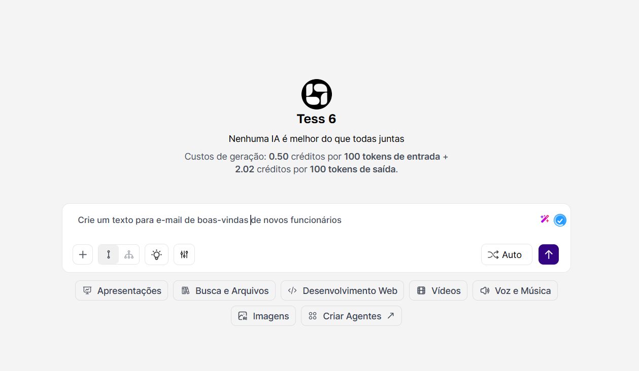 When you turn it on, Tess AI analyzes your request and automatically selects the model with the best balance between cost and performance for that specific task, optimizing the use of your credits.