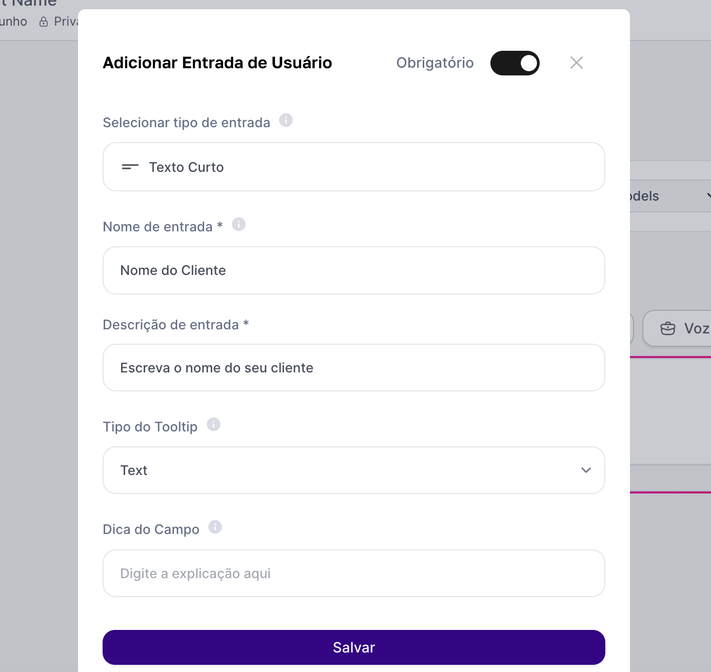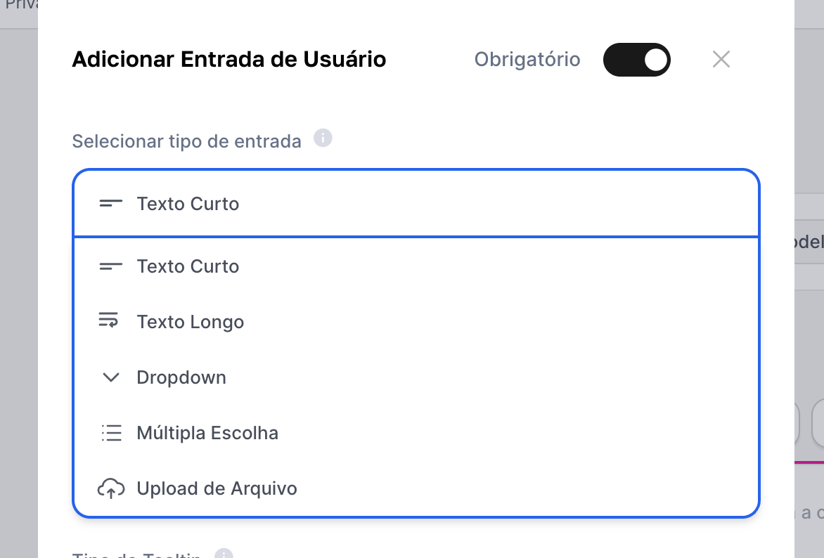 What it’s for: Limiting the choice to a set of options, like selecting a language (Portuguese, English), a department (Sales, Support), a tone of voice (Formal, Informal), or a specific action (Translate, Summarize).