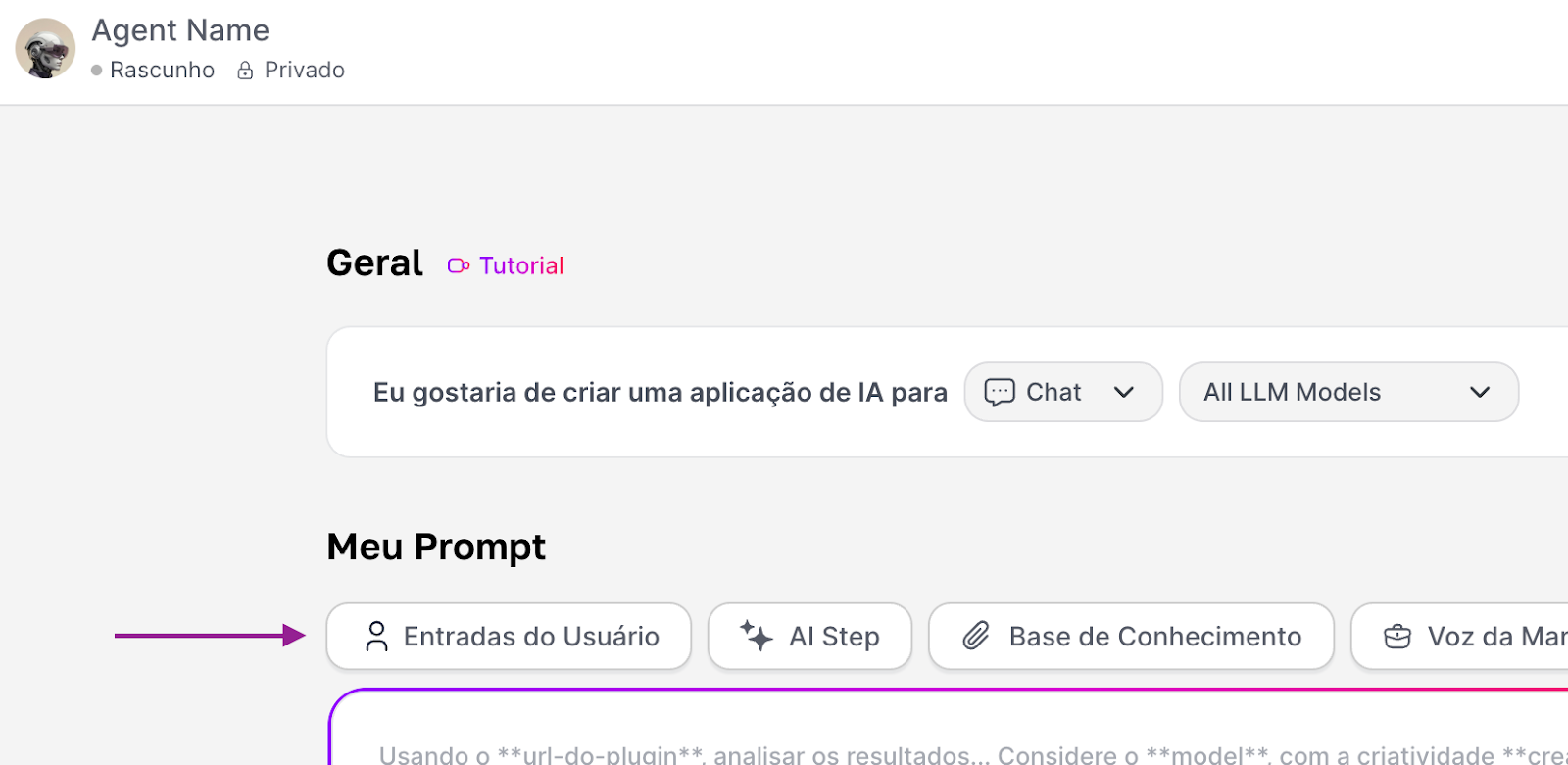 Example of use: A translator agent. The variable idioma_alvo ropdown) would offer options like "English", "Spanish" and "French". The instruction would be: "Translate the following text into the language **idioma_alvo**."