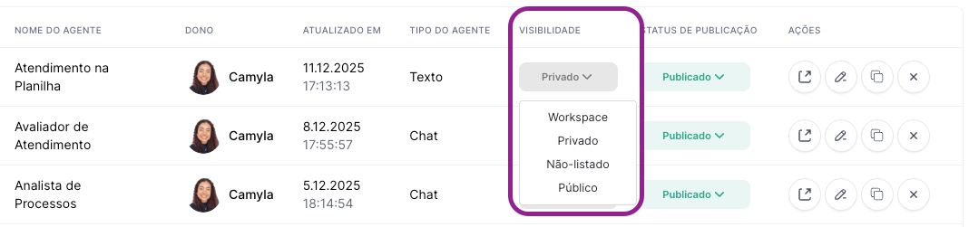 Private: only the creator of the agent can see it. Used for draft agents, tests, or personal agents.