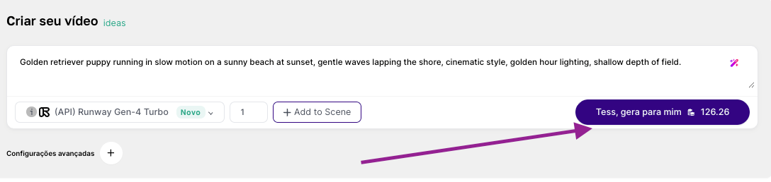After you send the prompt, Tess processes it and returns the clip. The cost to generate each video, according to the model you chose, will appear next to the generate button: