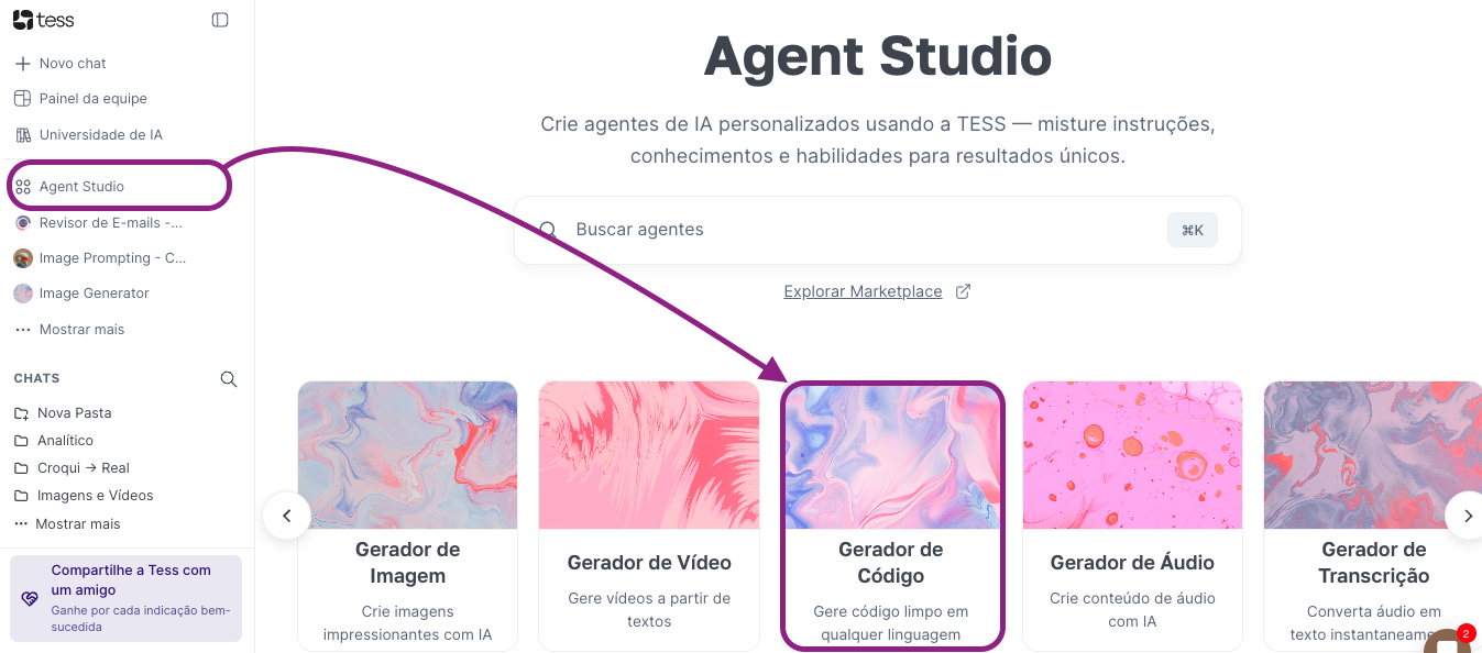 The Code Generator is an interactive chat environment powered by an Artificial Intelligence specialized in programming. Located in the Agent Studio tab under Code Generator, this generator is pre-trained to understand, generate, and debug code in practically every existing programming language.