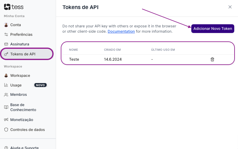 An API Token allows access to your Tess AI account through other applications. Never share your tokens publicly or expose them in front-end code (accessible via the browser). If a token is compromised, revoke it immediately and generate a new one.