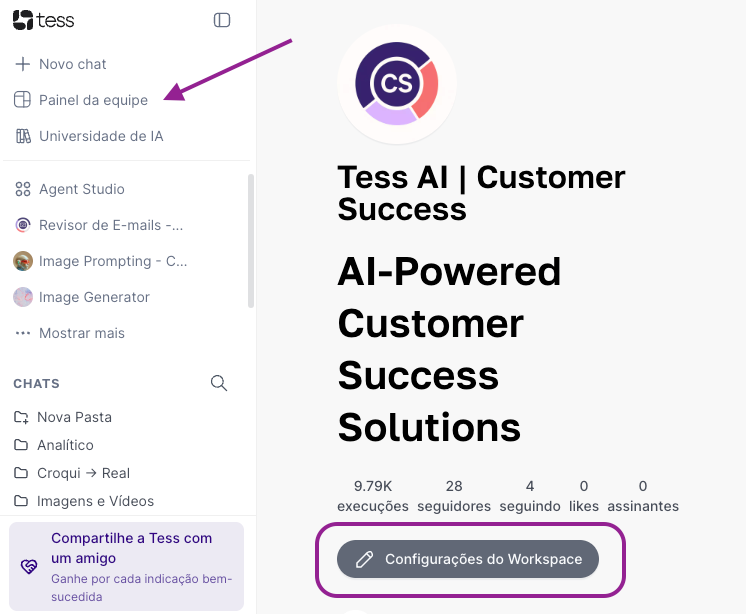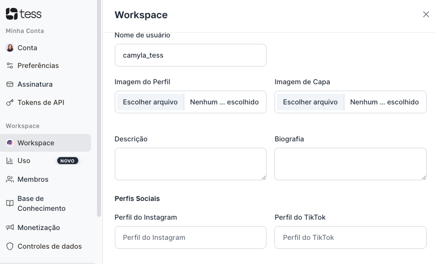 Think of the Workspace as the main profile of your account. It’s the page that represents your team or your company inside Tess AI. This is where you define the name, image, and information that all members and visitors will see.
