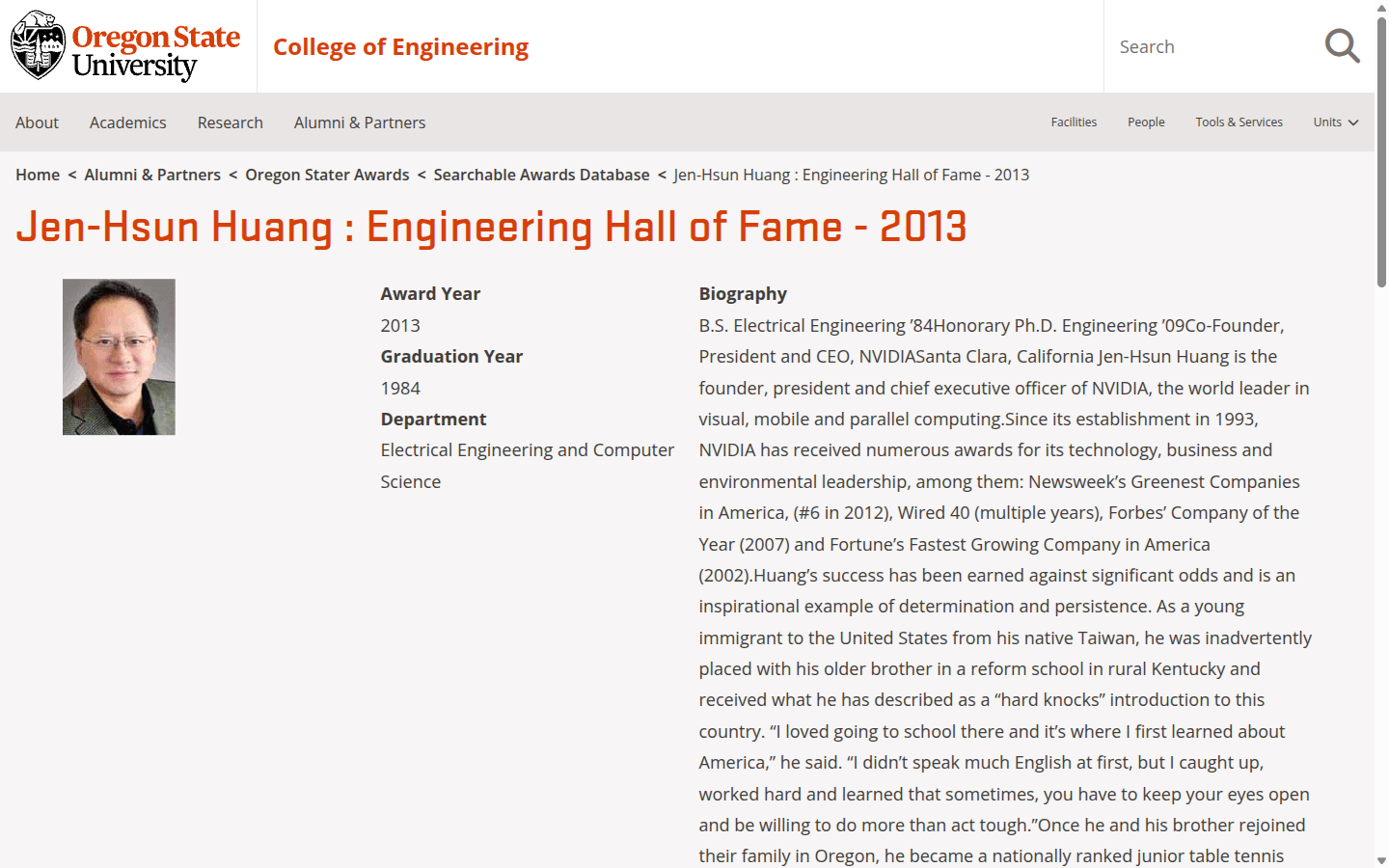 - Sources: NVIDIA Board Bio, Stanford Engineering Heroes, Oregon State University.